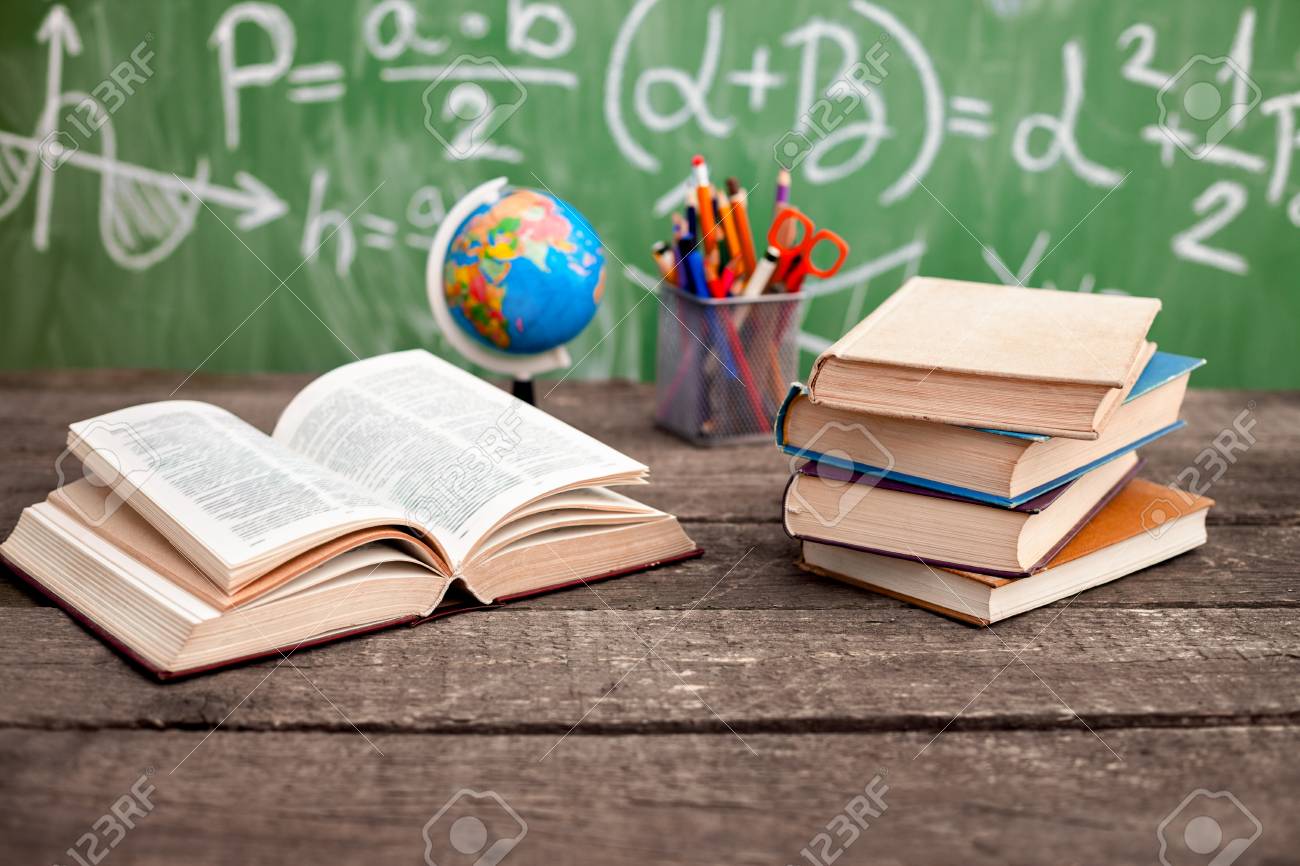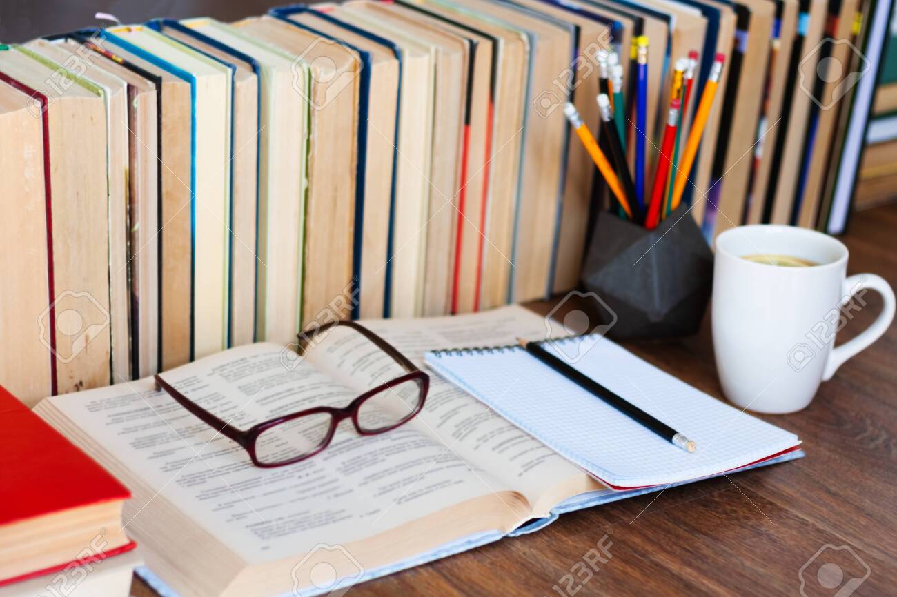 Open textbook, notebook, glasses, pencils in holder, cup of tea